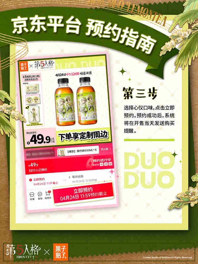 庄园茶会,多多干杯!4月24日中午12点,《第五人格》与果子熟了多多柠檬茶第三弹联名正式上线,这场筹备已久的"庄园茶会"将带着全新升级的惊喜,邀访客们共赴一场干杯之约。