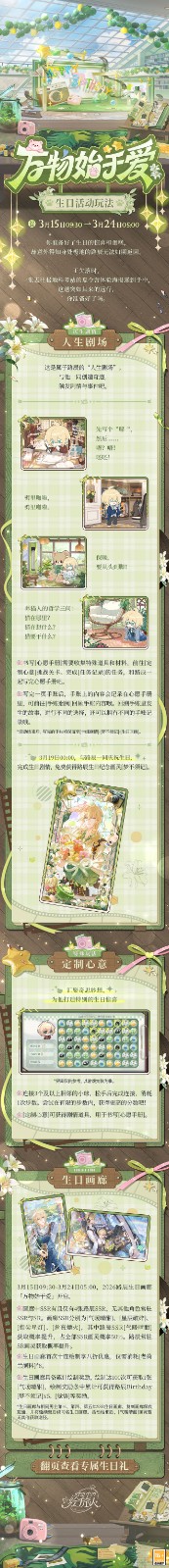 3月15日09:30 - 3月24日05:00,参与路辰生日活动「万物始于爱」,在生日当天与他共度,完成剧情即可免费获得1张生日纪念画灵[梦不须记]。