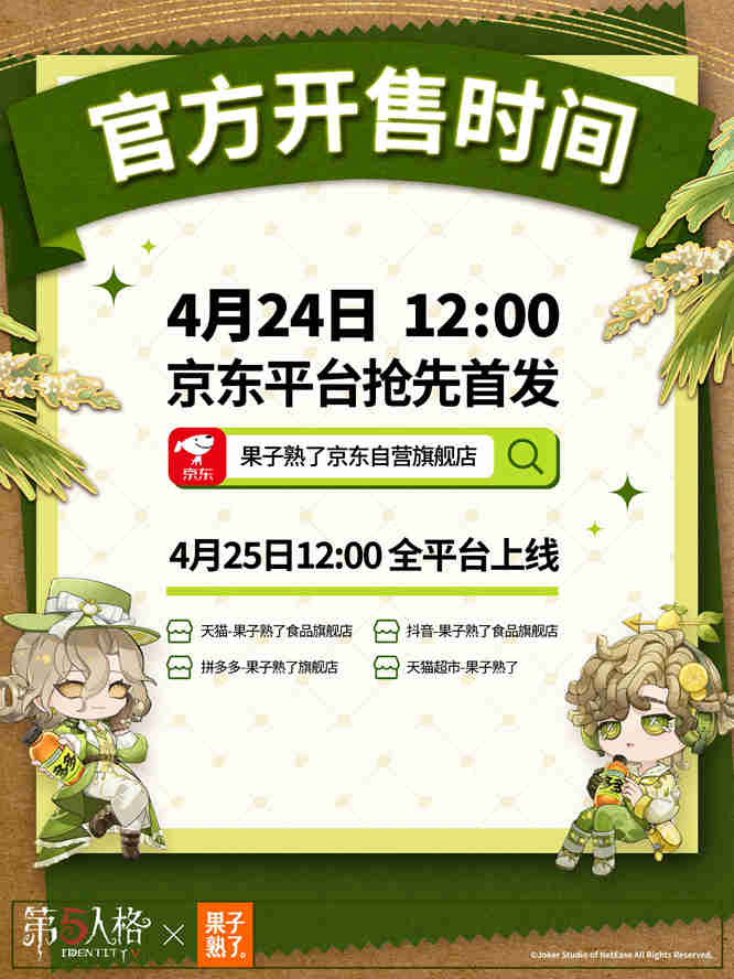 线上购物狂欢率先在京东平台引爆。4月24日中午12点起,京东果子熟了自营旗舰店将开启首发专场,购买联名款即可获赠气象学家【独特时装】-柠檬多多及联名周边。