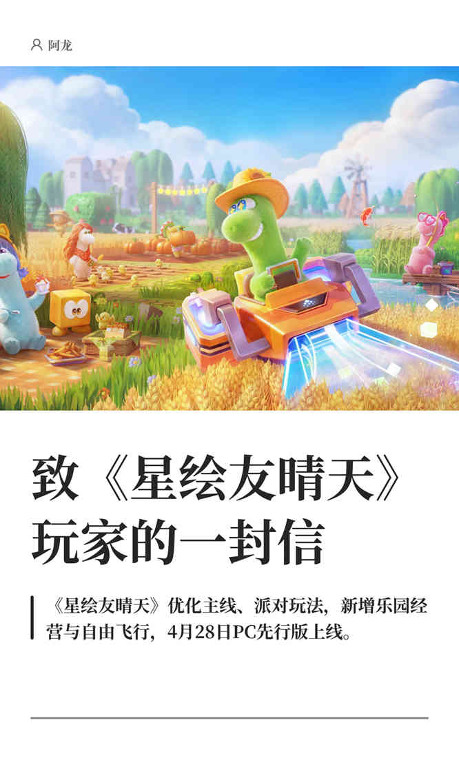 《星绘友晴天》融合了生活模拟与休闲派对玩法,将支持PC、移动多端互通。你将成为一颗立方星球的主理龙,白天种种地、晚上开Party!